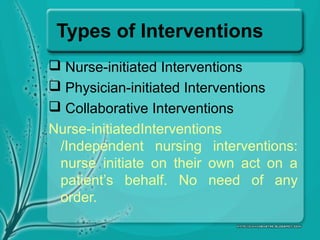 Nurse-initiated interventions are derived from the nursing diagnosis. Nurse-initiated interventions are actions performed to diagnose a medical. To provide quality patient care over a period of time nurses need a roadmap that guides their actions and quantifies desired outcomes.