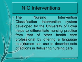 These nursing interventions come in two categories. And the documentation and communication of the data collected. Developed after interventions for the recent medical diagnoses are evaluated.
